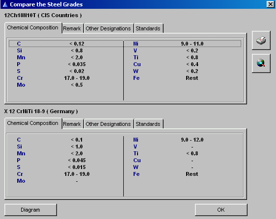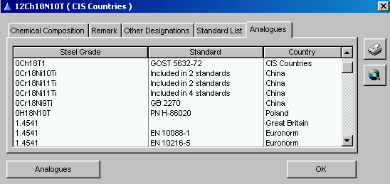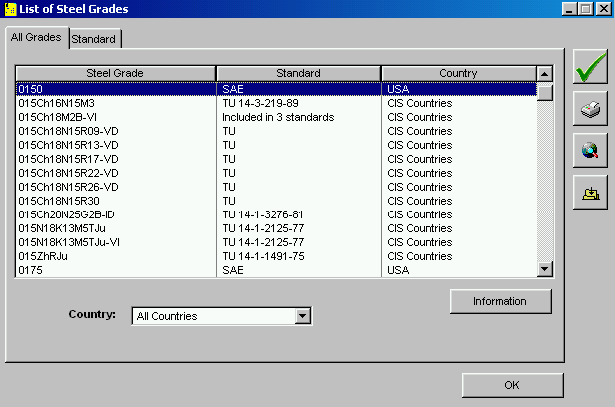 WinSteel 5.0 database contains data on more than 70,000 steel grades of 28 countries: CIS, USA, Germany, UK, Japan, France, Italy, Canada, Finland, Norway, Sweden, Austria, Spain, Switzerland, Belgium, Korea, Australia, Brazil, China, Poland, Hungary, Czech Republic, Slovakia, Bulgaria, Romania, former Yugoslavia, as well as grades included in European (EN) and two international (ISO and UIC) standards.