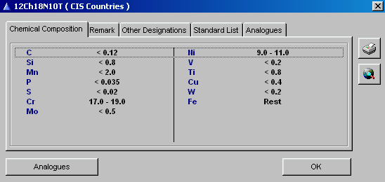 WinSteel, ver. 5.0 database contains data on more than 70,000 steel grades of 28 countries: CIS, USA, Germany, UK, Japan, France, Italy, Canada, Finland, Norway, Sweden, Austria, Spain, Switzerland, Belgium, Korea, Australia, Brazil, China, Poland, Hungary, Czechia & Slovakia, Bulgaria, Romania, former Yugoslavia, as well as grades included in European (EN) and two international (ISO and UIC) standards.